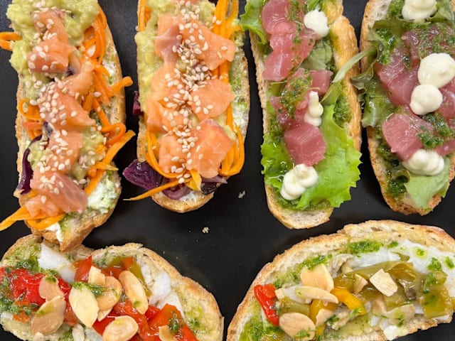 Tartare di salmone marinata al limone, burrata, pesto di prezzemolo, julienne di carote, insalata, crema guacamole, salsa teriyaki.