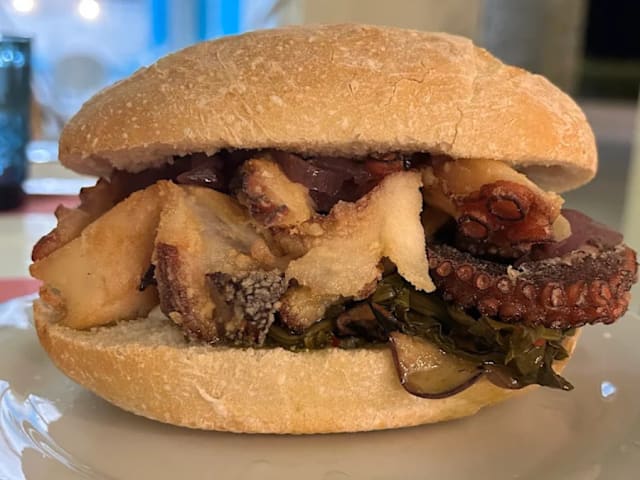 Polpo fritto, cime di rapa, melanzane grigliate, giuncata, cipolla caramellata, salsa yogurt, pesto di basilico.
