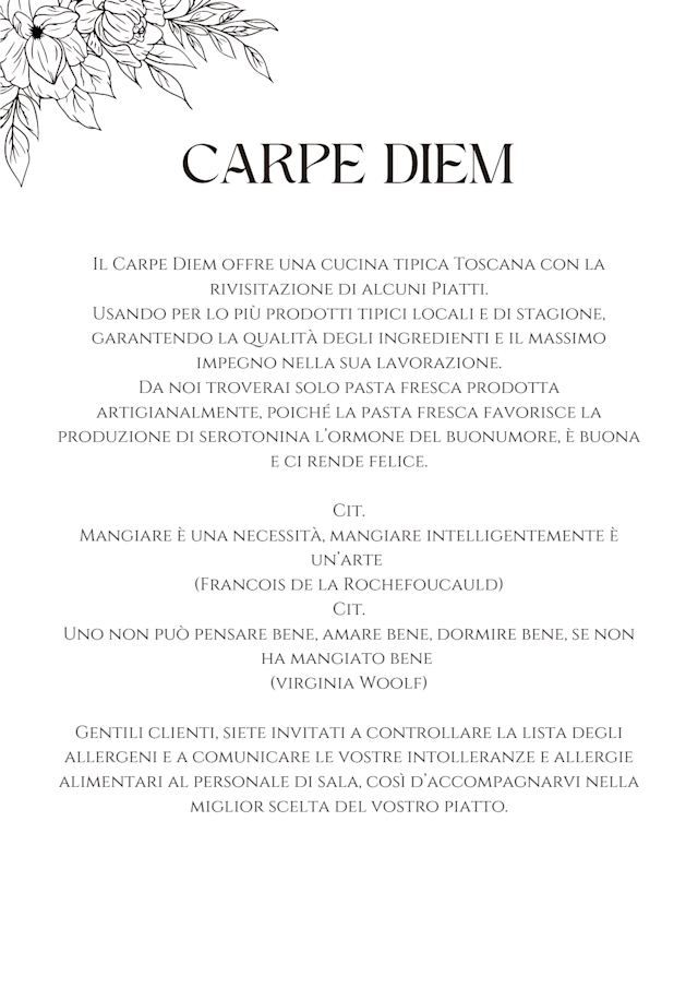 10/10What a wonderful way to start our time in Tuscany. Drove in from Rome to our Agriturismo and our host suggested a few places, Carpe Diem was one of the top. It did not disappoint. Our family enjoyed many drinks and dishes from our wonderful server while we watched the sun set. It was perfect. The only downside was we dined on a Sunday, so we were the only ones there but it didn’t matter to us. Grazie Mille.