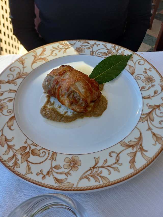 Quaglia disossata farcita con salsiccia e funghi porcini avvolta nella pancetta su crema di funghi