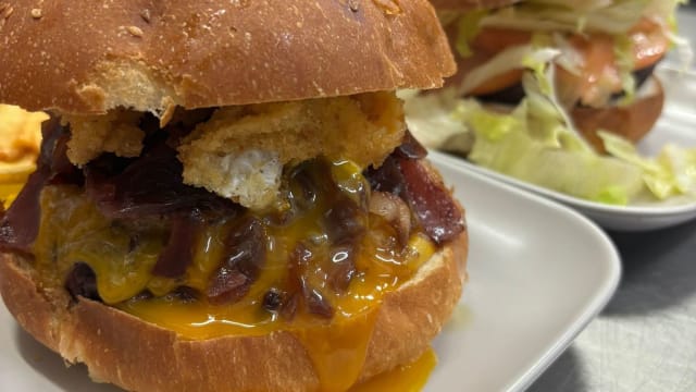 Bun con hamburger di scottona da 200g servito con nduja e auricchio, accompagnato da patatine*