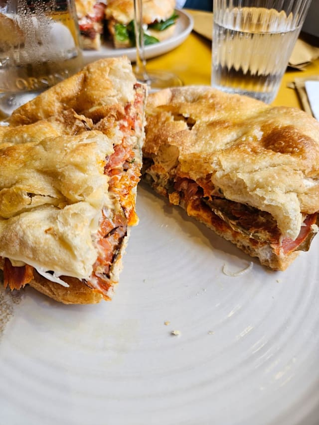 Songino, pomodoro, schiacciata dei nebrodi, maionese, pulled beef