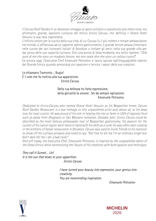 Dearest Ms. Vereecken, we are so happy, proud and grateful for your wonderful review that it is difficult for us to fully express our infinite gratitude. Knowing that we have done our job well is always a source of deep satisfaction, but reading that we have made your experience at the Caruso Roof Garden unforgettable, well this touches deeper chords, and not trivializing our response becomes difficult, if not impossible. So, we simply say thank you: your words are the best fuel to keep us going and striving to do better, and above all, to never disappoint our guests' expectations. Grazie!!!