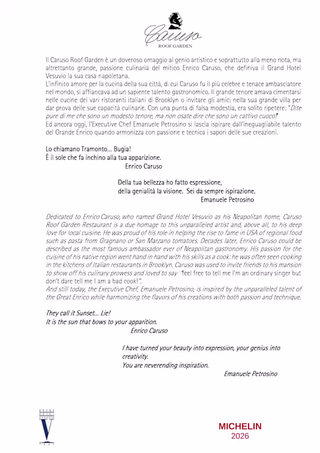 Dear Mr. Charenka, Our sincerest thanks for your kind review. Looking forward to welcoming you back to Caruso Roof Garden, we send our warmest regards. Grazie!