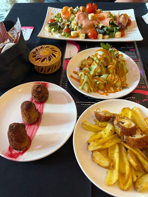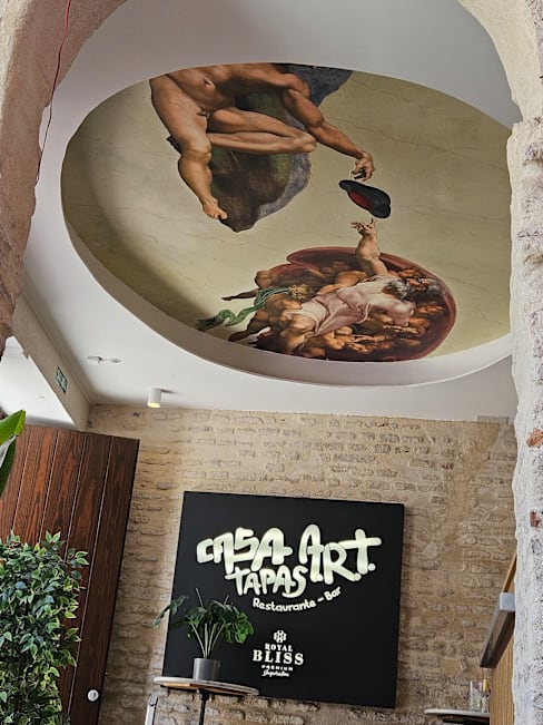 5/10Upon stepping into the vibrant Casa A.R.T. Tapas, one is immediately struck by the place’s artistic flair, set against the picturesque backdrop of Sevilla’s storied streets. Unfortunately, this artistic haven does not seem to shield its patrons from the chill of colder days. The open door policy, presumably to welcome passersby, unwittingly invites the cold in, necessitating a stay wrapped in warm attire—an unpleasant companion for a meal. The staff, while courteous, lack a certain finesse with the glassware and bottles, indicative of a need for further training. This, paired with an apparent absence of area control to ensure timely service, detracts from the overall dining experience. One’s patience is tested with notably long waits for the kitchen’s output, an issue that is particularly egregious when the sequence of service falters, as it did when the main course precedes the appetizers, leading to an awkward imbalance in the dining ritual. The paella, a quintessential Spanish dish, is served with an authentic warmth but lacks generosity in its filling, a deviation from the hearty Spanish culinary spirit. At a standard price, this might be a point of contention, though with a discount, the value equation balances out somewhat in its favor. The pork with whiskey sauce promised an adventure but unfortunately took a wrong turn with a heavy-handed use of cumin, overwhelming the intended flavor profile. In stark contrast, the hake in green sauce shines brightly—a commendable offering with perfectly seasoned fish bathed in a sauce that deserves all accolades. It stands as a testament to the kitchen’s potential when the elements align correctly. Dessert, in the form of a brownie, is a finale that tests one’s time again. While the ice cream that accompanies it is a homemade delight, the brownie itself, particularly when marred by an overly sweet syrup, falls short of the mark. A suggestion for future patrons: request the brownie sans syrup or, perhaps, skip straight to the ice cream. The atmosphere, while possibly suited for a night out with its club-like music, might not harmonize with the expectations of a lunchtime patron, calling for a rethinking of the auditory experience to match the daytime mood. In summary, Casa A.R.T. Tapas offers a culinary journey with peaks and valleys, where each dish tells its own story of artistry and execution. The venue scores high on cultural ambiance and the potential of its offerings, yet there is room for refinement, especially in service dynamics and course timing. The culinary brushstrokes here are bold, sometimes missing the mark, but at times painting a delicious canvas worth savoring.