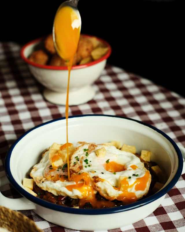 - Yema líquida y dorada sobre patatas crujientes, con láminas generosas de jamón de bellota.