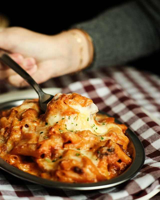 - Canelones caseros con relleno tradicional, gratinados con bechamel cremosa y queso manchego fundido.