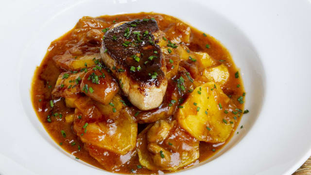 - Huevos rotos con cebolla caramelizada, foie poêlé y jugo de carne