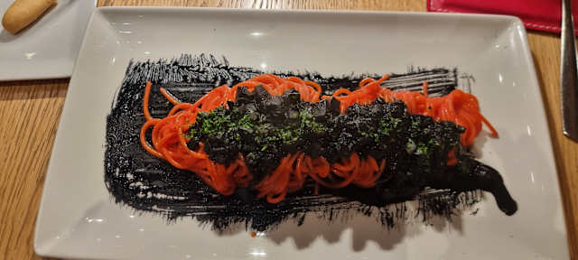 - Tataki di filetto di manzo “damini” glassato al liquore di prugna “la dinamica” con zucca arrostita