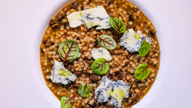 Fregola sarda mantecata al formaggio di fossa e crema di sedano rapa, lingua fondente, funghi e friggitelli