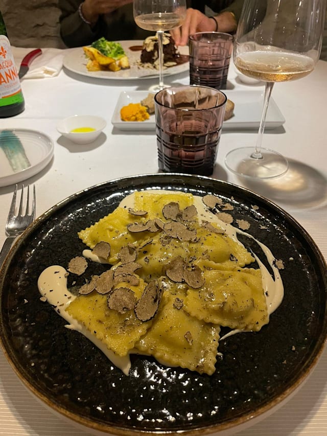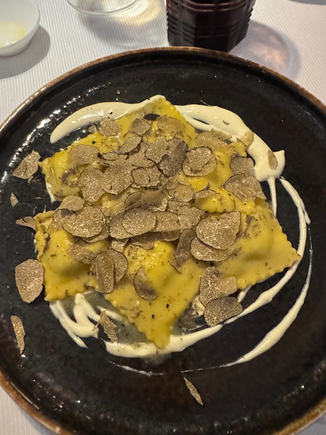 Ravioli di sfoglia ruvida fatta a mano, ripieni di ricotta reale seiras e tartufo nero, servito con leggera crema di formaggio e tartufo nero fresco affettato a crudo