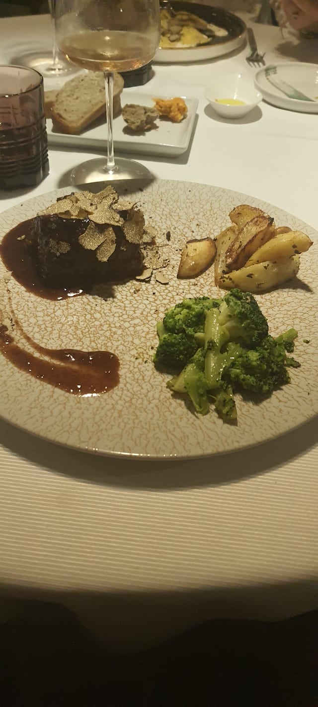 Dalla padella, il filetto di manzo di filiera nazionale sfumato al vino porto della cantina nieeport, al tartufo fresco affettato a crudo, con verdure di stagione