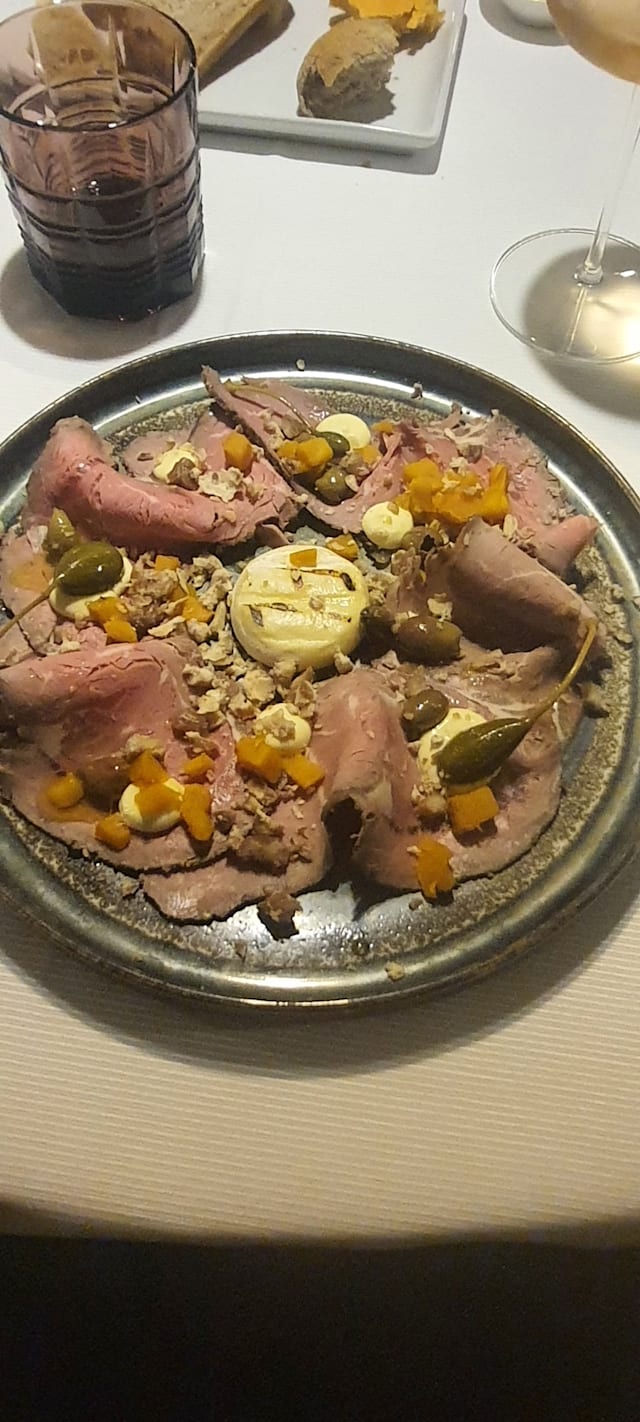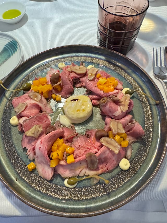 Roastbeef di controfiletto cotto a bassa temperatura accompagnato da olive taggiasche, capperi, cubetti di zucca arrosto, castagne e tomino tiepido