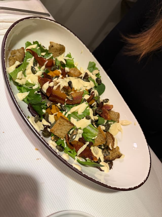 Insalata di foglioline verdi miste, con cubetti di zucca arrosto, crostini croccanti, semi di zucca tostati, guanciale e leggera crema di formaggio tiepida