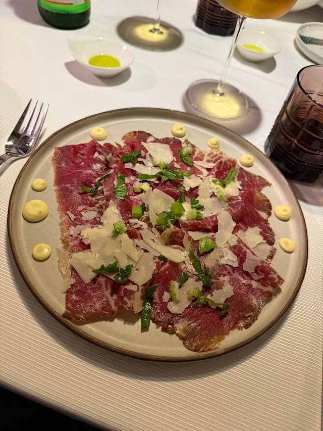 Carpaccio di manzo affumicato, da tagli pregiati, servito con scaglie di parmigiano reggiano DOP stagionatura minima 30 mesi, sedano croccante e finger lime