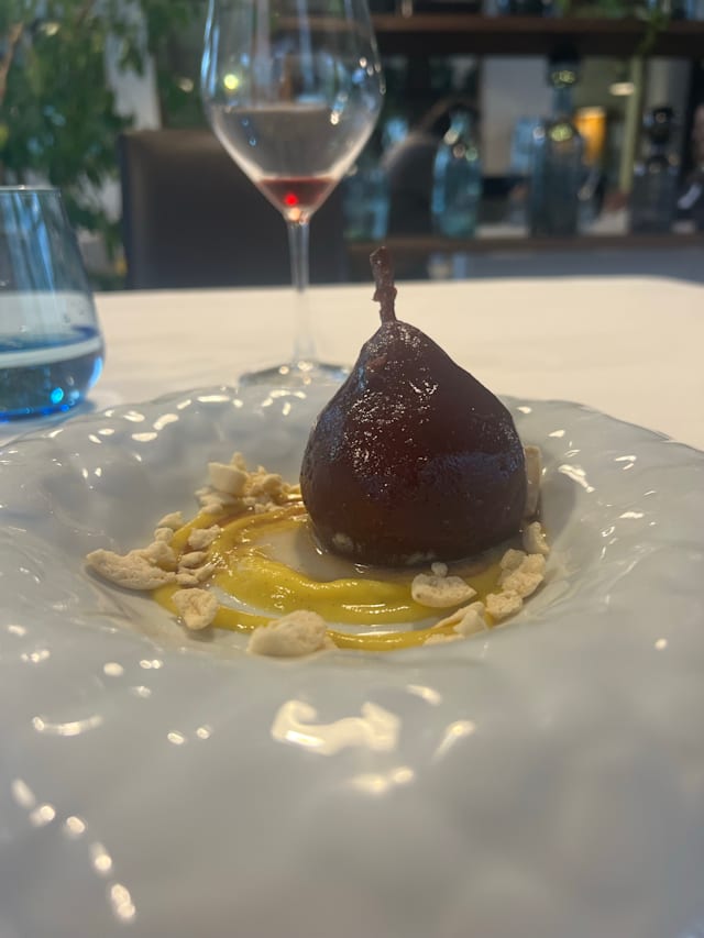 Pera williams cotta nel vino rosso della cantina dei girasoli di sant’andrea alle spezie d’autunno, con crema inglese alla vaniglia