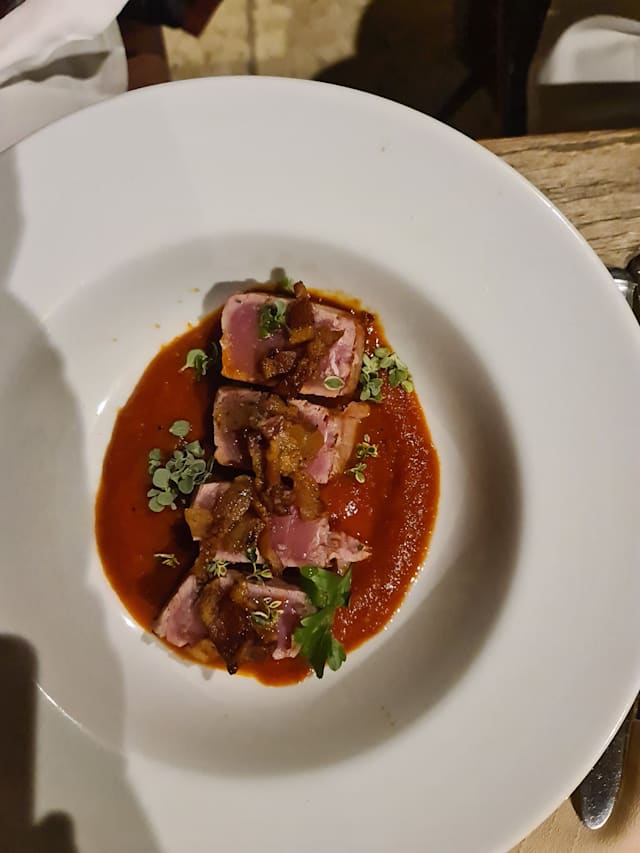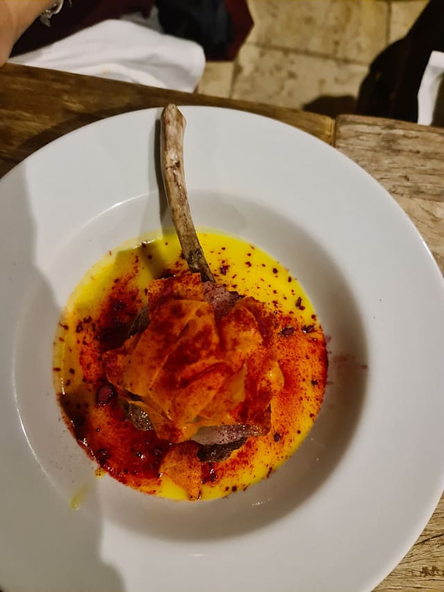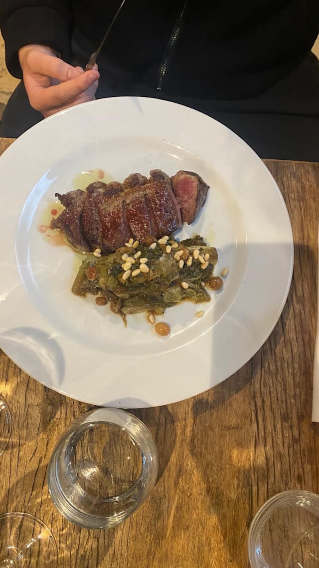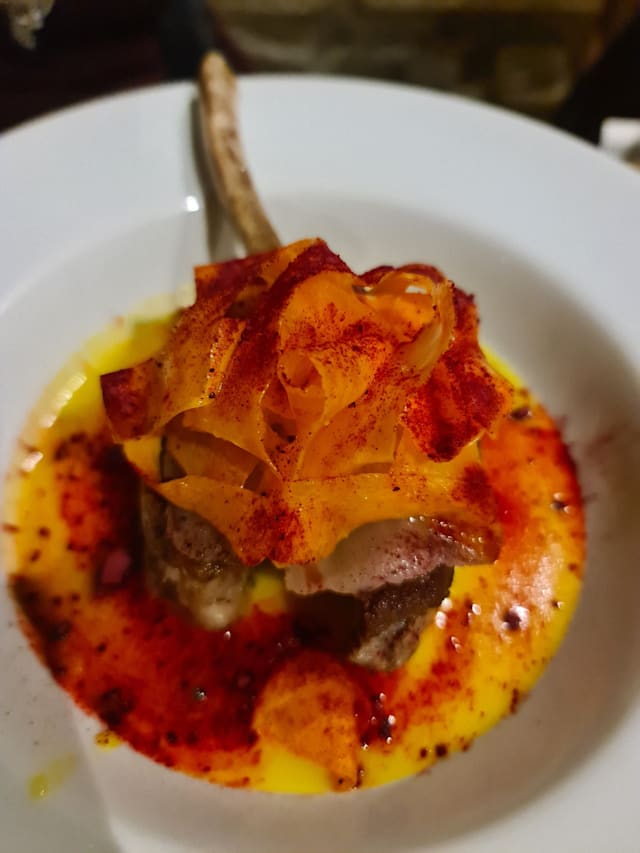 Filetto di maiale cbt, finto fondo di verdure, lardo e miele di tolfa