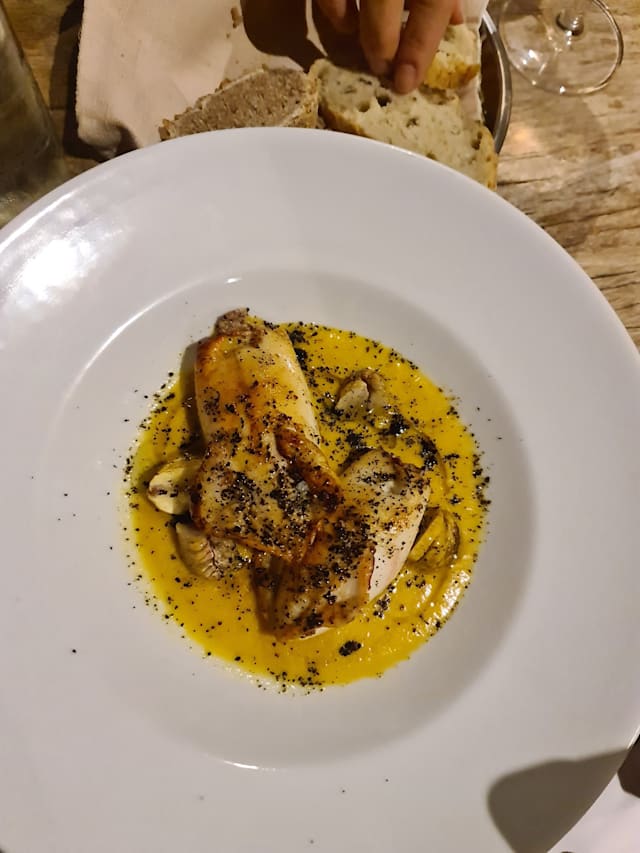 Bun alla curcuma, polpo rosticciato, finto ketchup, olive e capperi