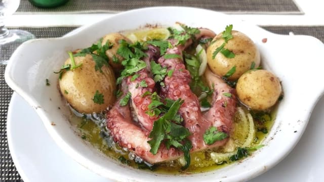 Polvo, pimentos, cebola, alho e coentros picados, servido com pão caseiro torrado