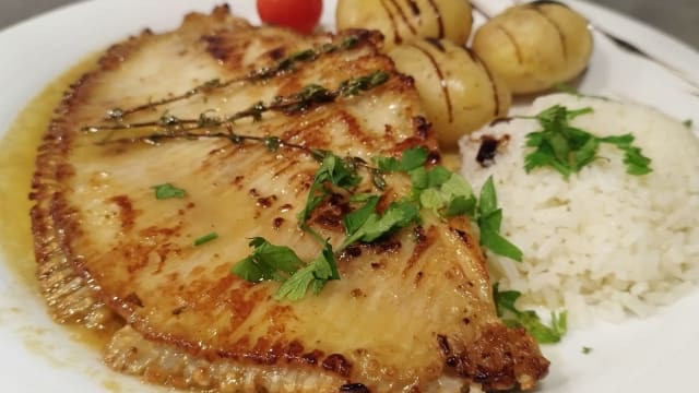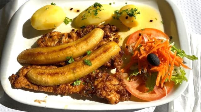 Filete de peixe espada preto frito com banana e molho de maracujá, acompanha com batata cozida