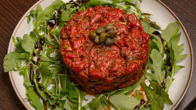 Viande argentine hachée au couteau, marinée au chimichurri accompagnée d'un salade.