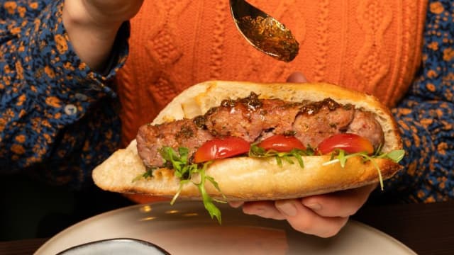 Sandwich typique argentin avec pain, chorizo argentin et sauce chimichurri.