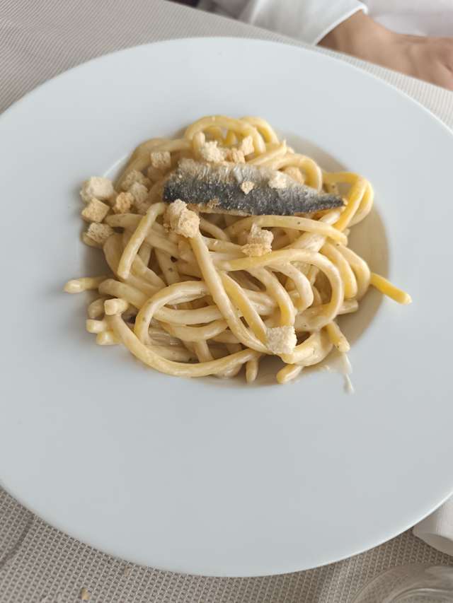 - Bigoli di pasta fresca, salsa di sarde al latte, crostini alla lavanda e agone del garda fritto