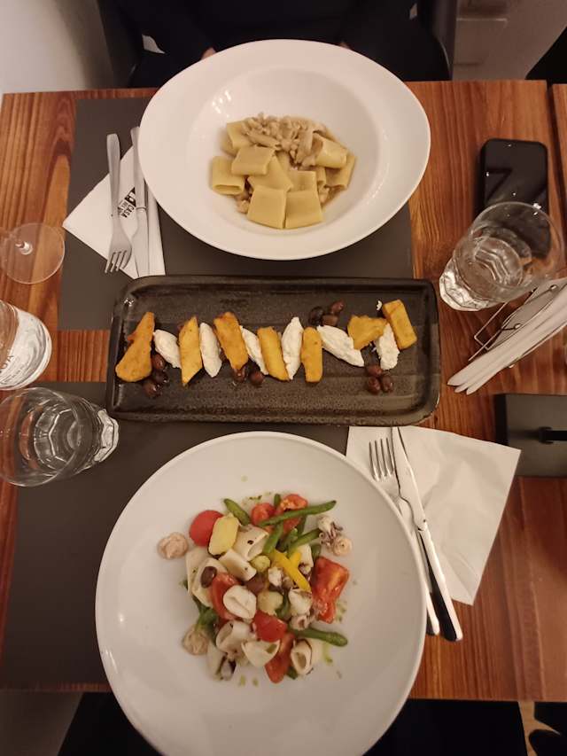 - Mezzemaniche con salsiccia, pomodori secchi, broccoletti e perocino romano
