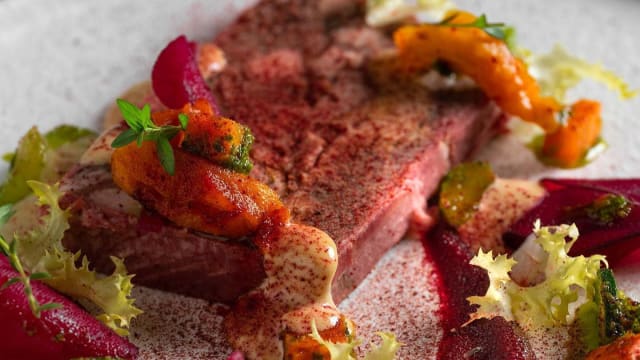 Bavetta di fassona al barbecue, crema di scalogno e sesamo, chimichurri e primizie primaverili