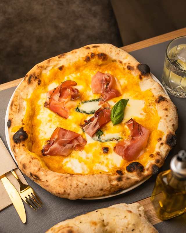 - Base de crema de porcini y trufa blancа, mozzarella y speck.