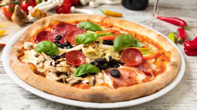 mozzarella, tomatensaus, yorkham, salami, champignons, olijven, artisjok en pikante rundersalami