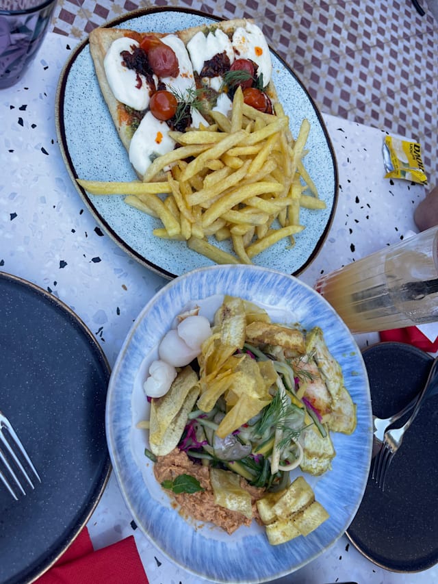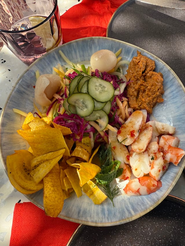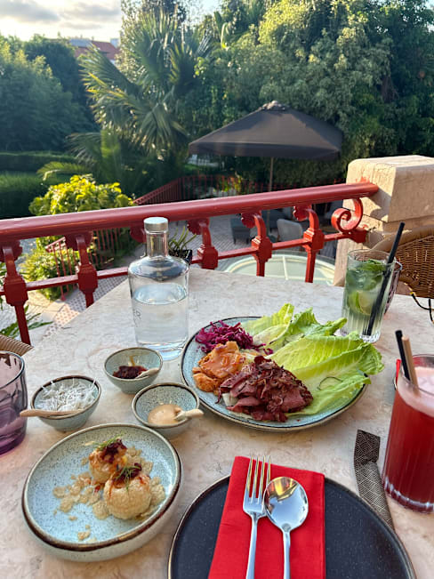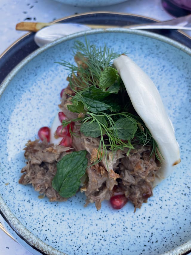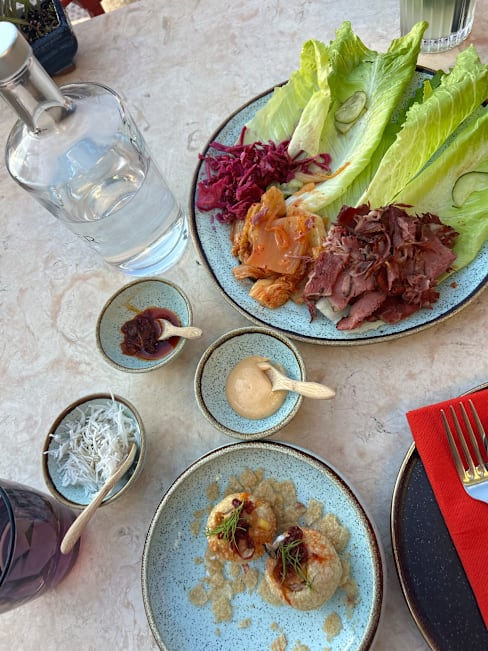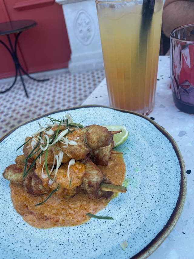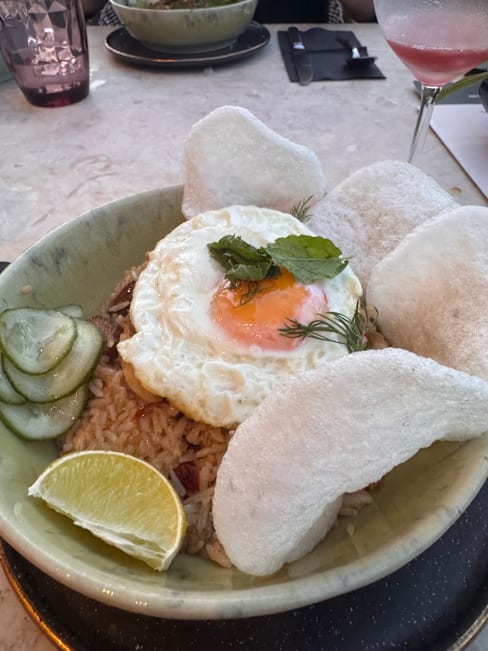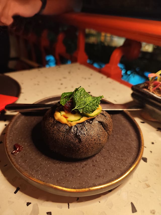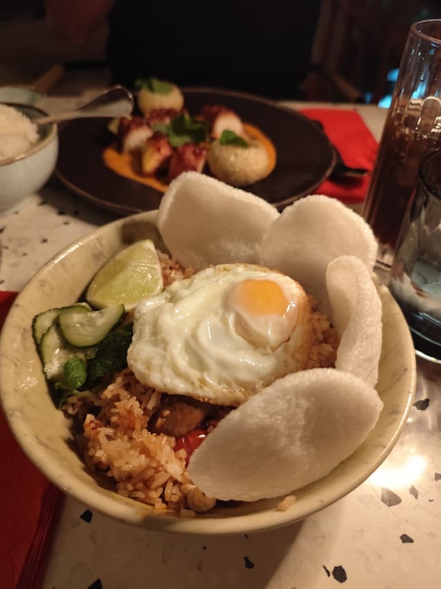6.5/10The restaurant has a wonderful atmosphere, but unfortunately, the rest of the experience does not live up to the premium prices. The food is quite average overall. We tried the Black Bambu Bread, Pastrami Green Tacos, and the Pla Tod. The Black Bambu Bread was good, but €21 for a single meat bun feels excessive and hard to justify. The Pastrami in the tacos had an artificial flavor. The Pla Tod was nicely fried and fresh, which I appreciated. However, the rice served with it was very bland and lacked any flavor. Service was friendly, but lacked professionalism and efficiency. To top it off, the 10% mandatory service fee felt unwelcome, especially given the overall experience. In summary, while the setting is great, the food and service don’t match the high prices.