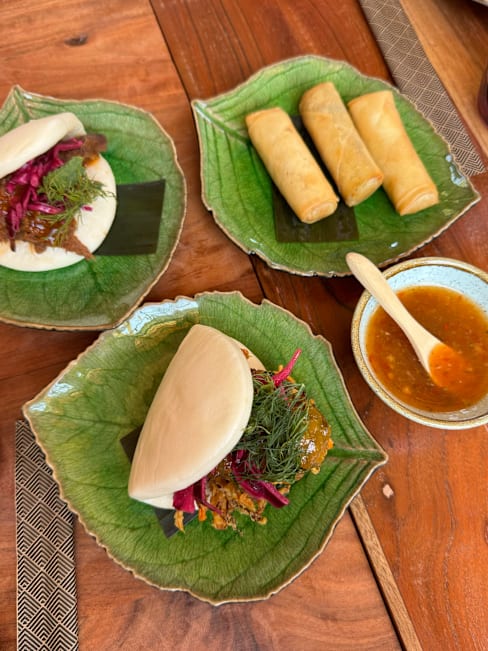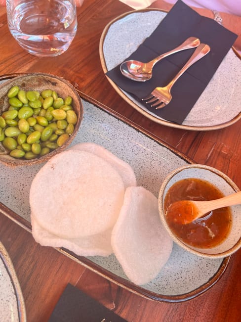 6.5/10The restaurant has a wonderful atmosphere, but unfortunately, the rest of the experience does not live up to the premium prices. The food is quite average overall. We tried the Black Bambu Bread, Pastrami Green Tacos, and the Pla Tod. The Black Bambu Bread was good, but €21 for a single meat bun feels excessive and hard to justify. The Pastrami in the tacos had an artificial flavor. The Pla Tod was nicely fried and fresh, which I appreciated. However, the rice served with it was very bland and lacked any flavor. Service was friendly, but lacked professionalism and efficiency. To top it off, the 10% mandatory service fee felt unwelcome, especially given the overall experience. In summary, while the setting is great, the food and service don’t match the high prices.