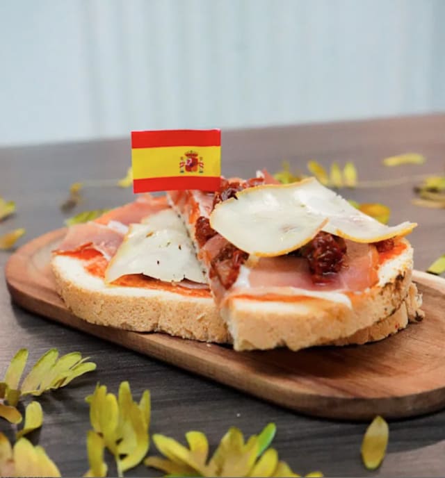 - Sélection selon l’arrivage : serrano, tomate confite, fromage, anchois ou morcilla de bellota, délicatement disposés sur une large tranche de pain grillé parfumé à l’ail et à l’huile d’olive.