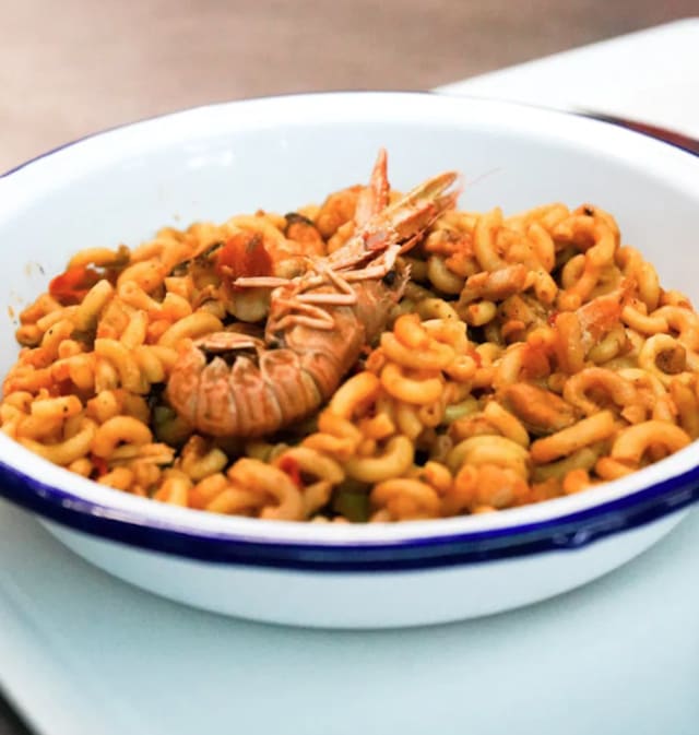 - Délicat pincho de poulpe servi sur un riz safrané, sublimé par une huile d’olive vierge et une pointe de citron