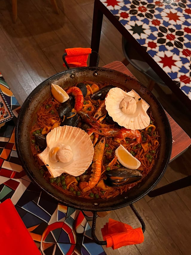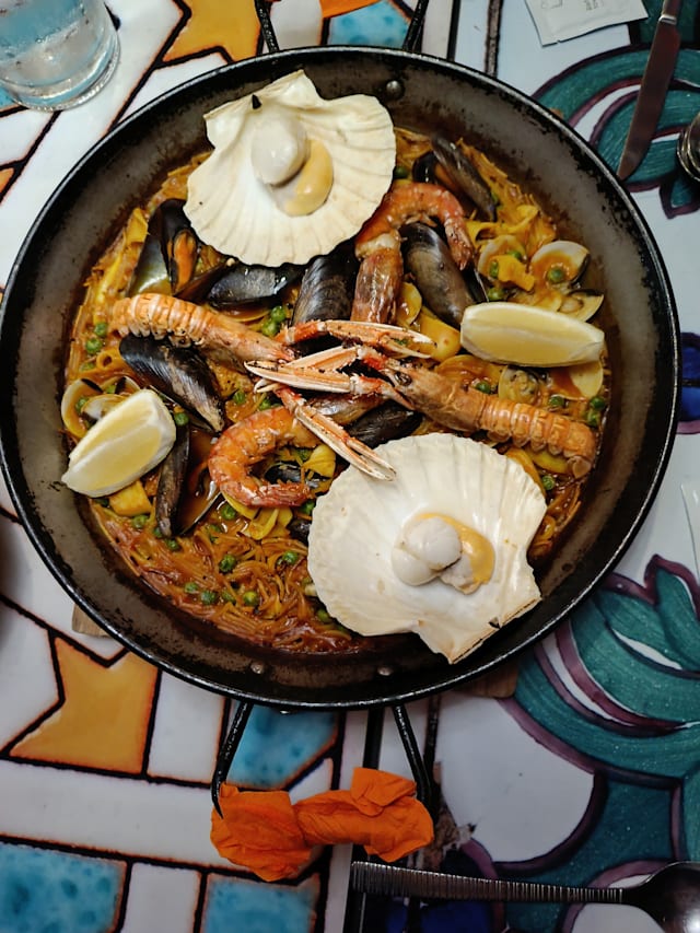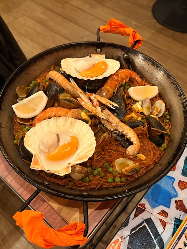 Pasta corta spagnola, calamari, cozze, vongale scampi, gamberi, tagliatella di seppia, capasunta e salsa aioli