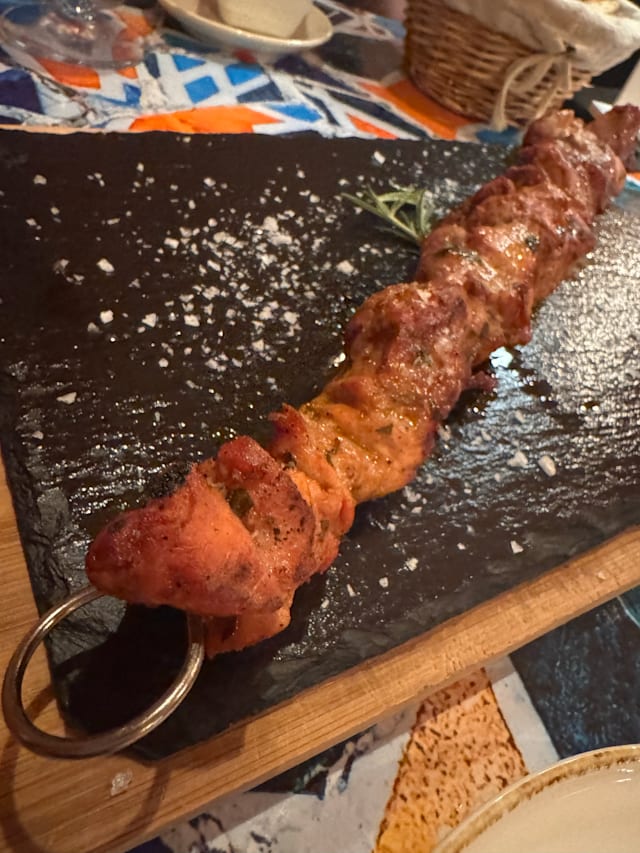 Spiedini di carne di maiale marinata, con pimentón, cipolla, coriandolo, zafferano, cannella, olio d'oliva succo di limone e pepe nero.
