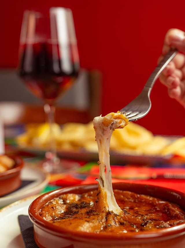 Carne di manzo, guanciale iberico, provoleta, cipolla caramellata, maionese di piquillos. Insalata, buns di patata, patatine fritte.