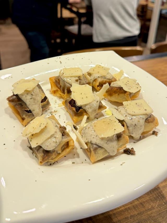 Raviolis fritos rellenos de rabo de toro salsa de queso y trufa.