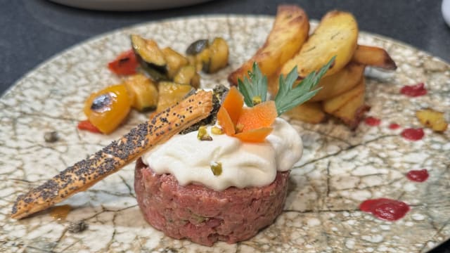 Tartare di manzo con maionese ai capperi cipolla candita e burrata
