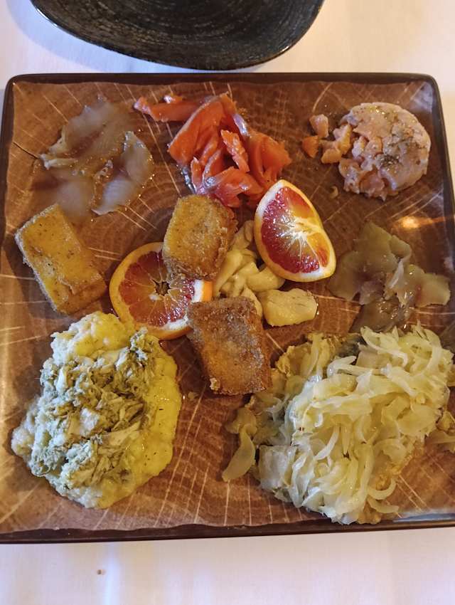 - Bresaola, lonzino alle erbette, coppa affinata alle vinacce, pancetta affinata al fieno e camomilla - con le nostre olive affumicate e giardiniera al miele e ginepro