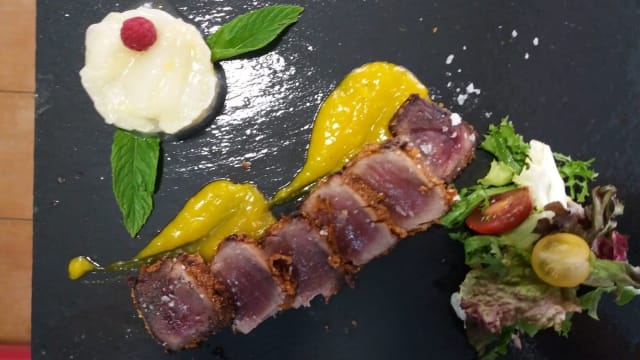 Atún rojo bañado en crema de almendras