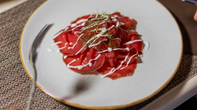 Diaframma di vitello alla brace, insalatina di pestanaca e mayo al cappero