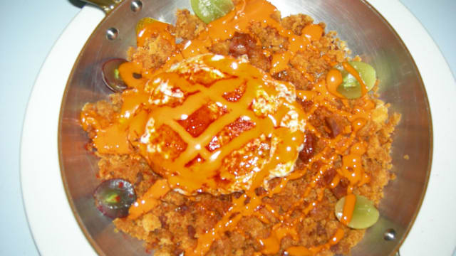 Bollo de pan preñado de huevo frito con trufado de morcilla y chorizo