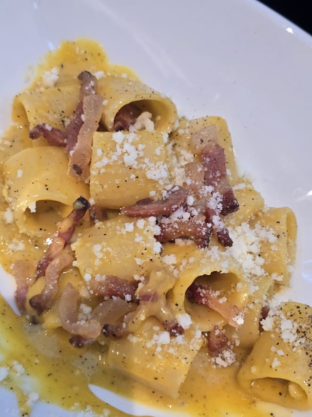 Paccheri alla carbonara e guanciale croccante di amatrice