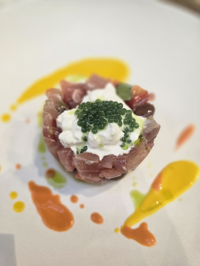 Tartare di tonno pinna gialla, pomodori datterino, olive taggiasche, basilico e stracciatella di burrata