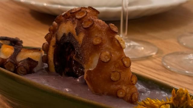 Polpo* arrosticciato con pancetta croccante, pure di ceci e cipolla agrodolce