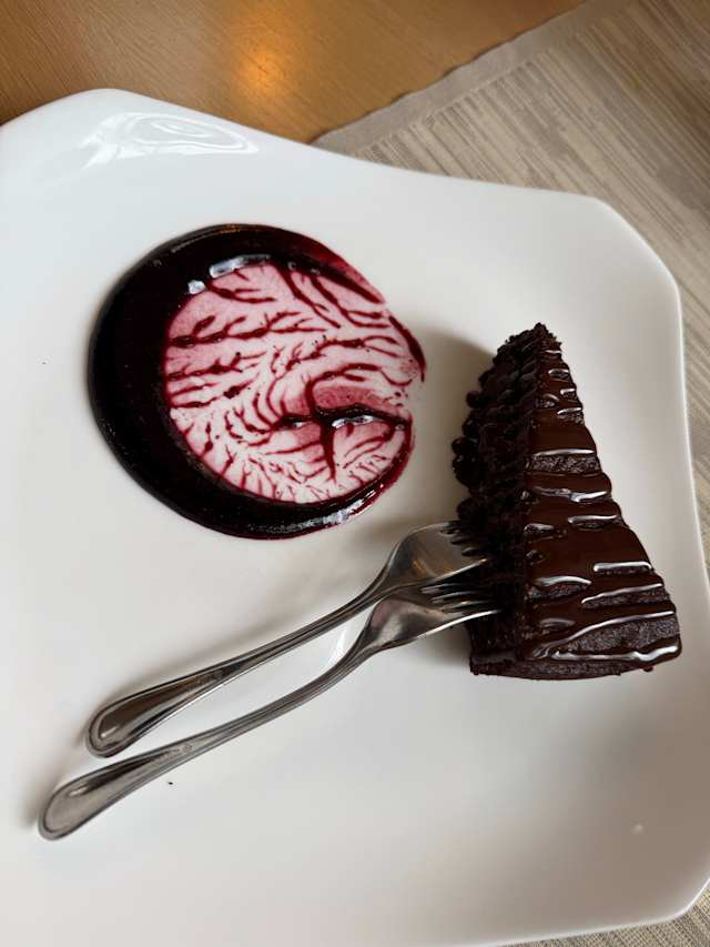 - Gola: erborinato di bufala stagionato 120 giorni, bagna al cherry, ciliegie, glassa di cioccolato