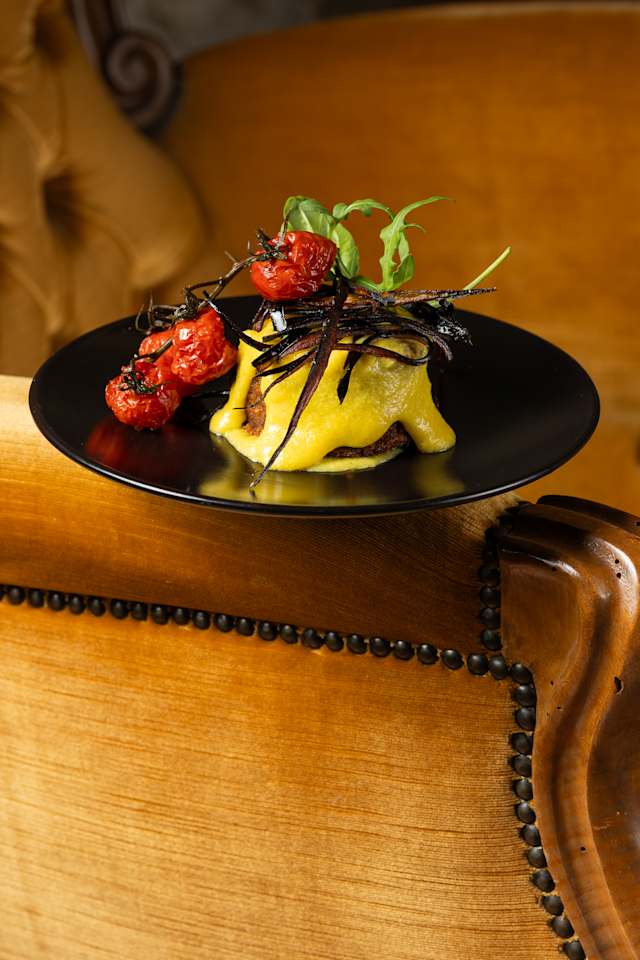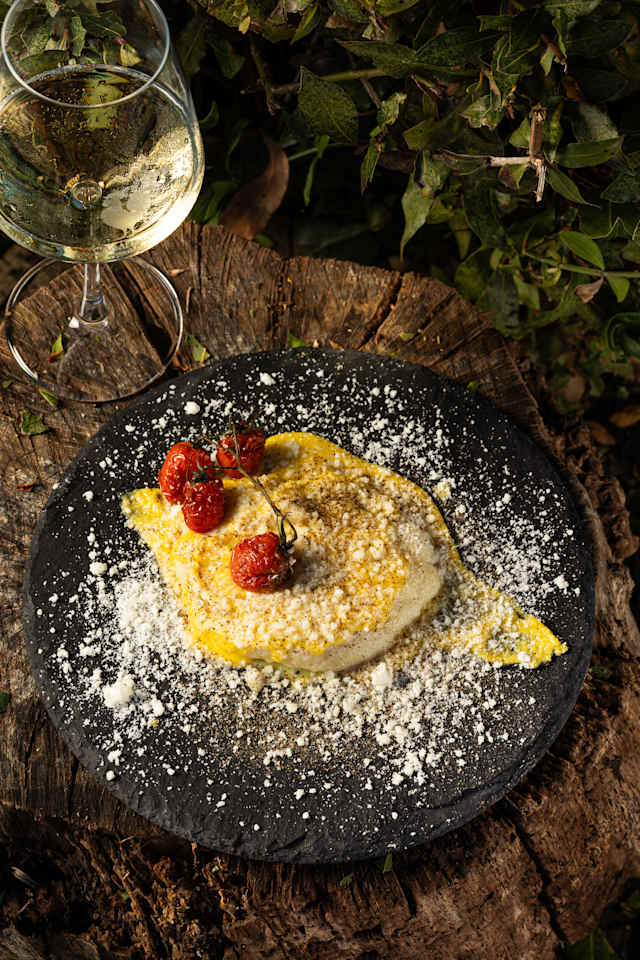 - Gnocco fatto in casa con cacio, pere e pepe accompagnato da salsa allo zafferano