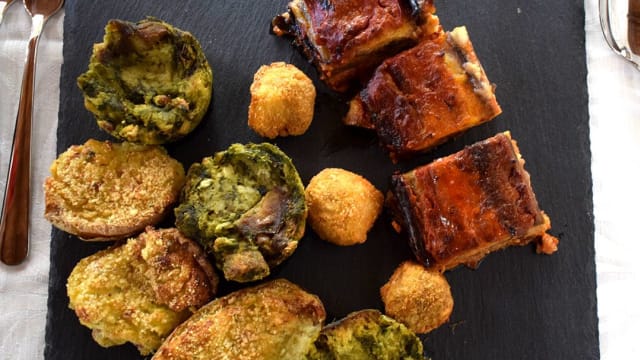 Selezione di salumi e formaggi, parmigiana di zucchine,sfornatino di pancotto, zuppa di cipolla, la patagna, bon bon di ricotta